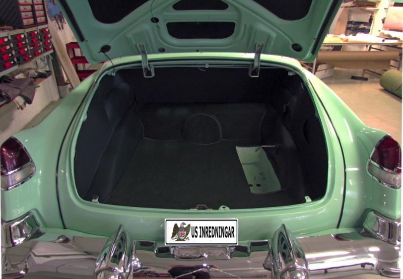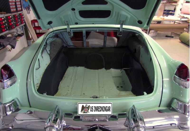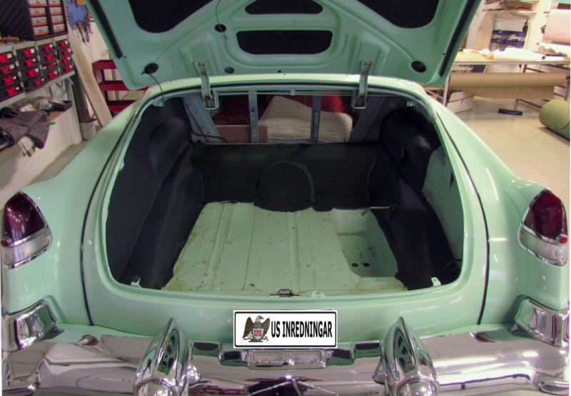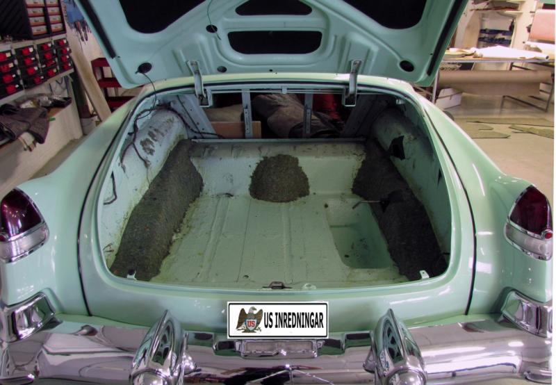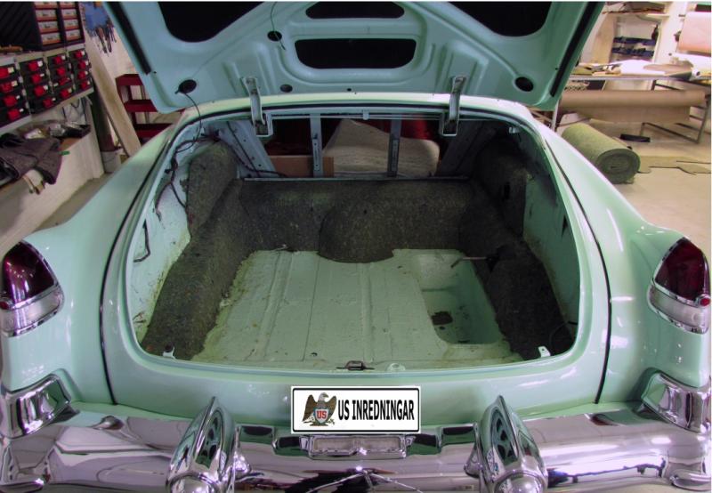 Matta limmad på papp samt papp över gångjärn och bak stammen,samma matta på hjulhus,golv sidor golv ,lås kista,mm.